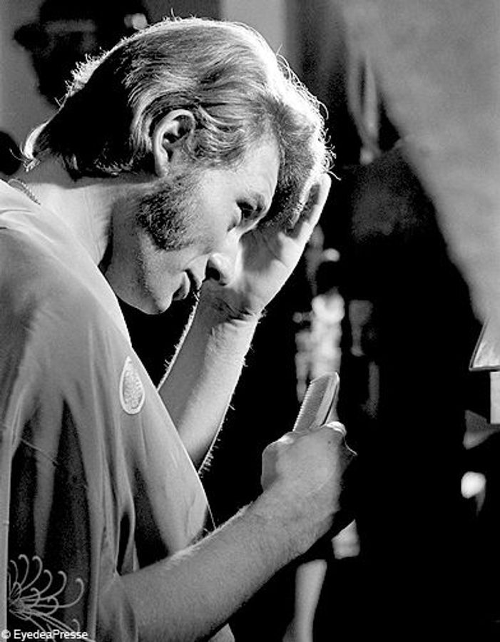 Johnny Hallyday And Sylvie Vartan At The Olympia. Paris- 16 mars 1967- Portrait de Johnny HALLYDAY se changeant dans la loge sous les yeux de son épouse Sylvie VARTAN à l'Olympia.